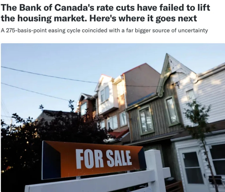 按理说,这么猛的降息力度,本该是给房市打鸡血的强心针,结果加拿大房市不仅没回暖,反而陷入“躺平”状态。